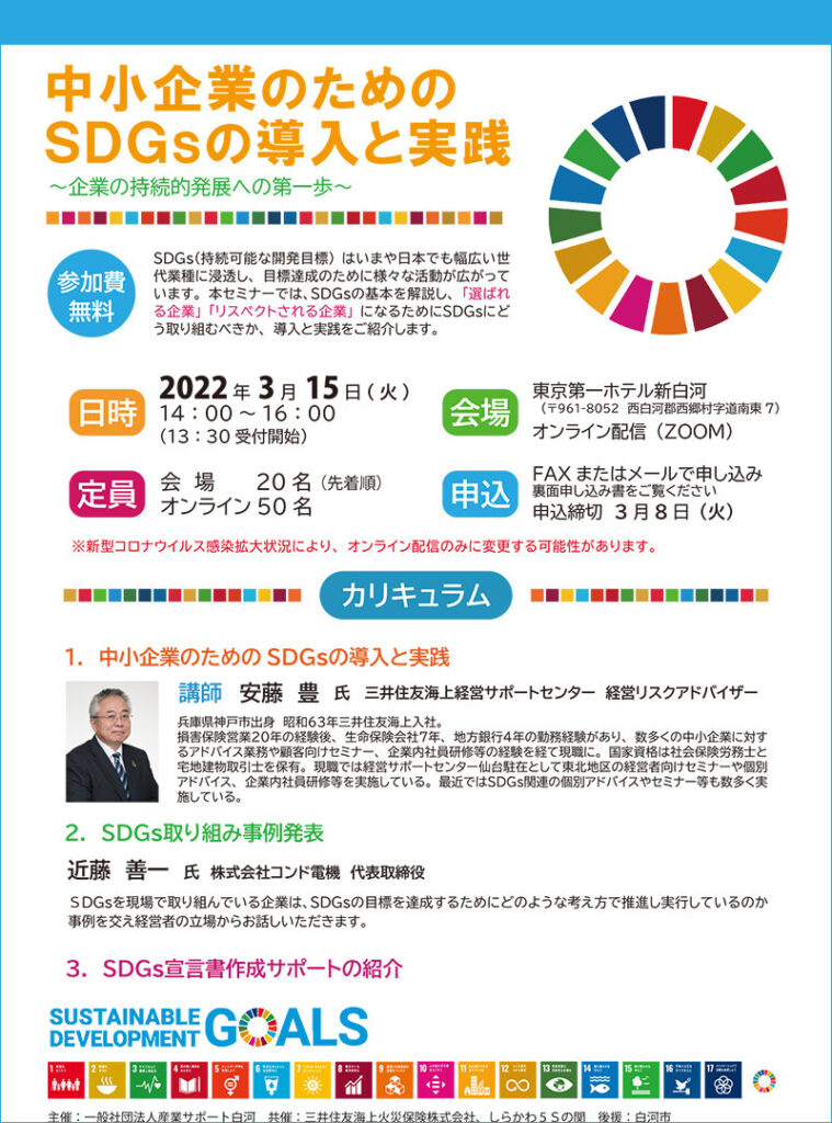 去る2022年3月15日(火)に東京第一ホテル新白河にて「中小企業のためのSDGsの導入と実践セミナー」を開催いたしました。