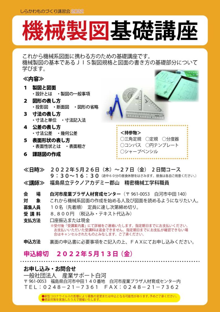 (終了しました)5/26(木)、5/27(金)2日間 機械製図基礎講座 受講募集(しらかわものづくり講習会2022)(4/26新着)