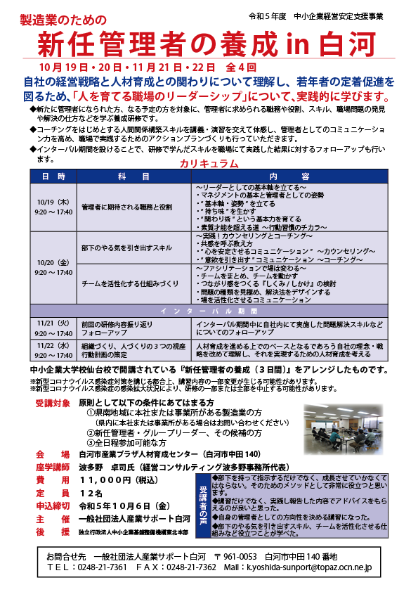 (10/12締切)「製造業のための新任管理者の養成in白河講座(10/19~20・11/21~22の全4日間)」受講者募集中