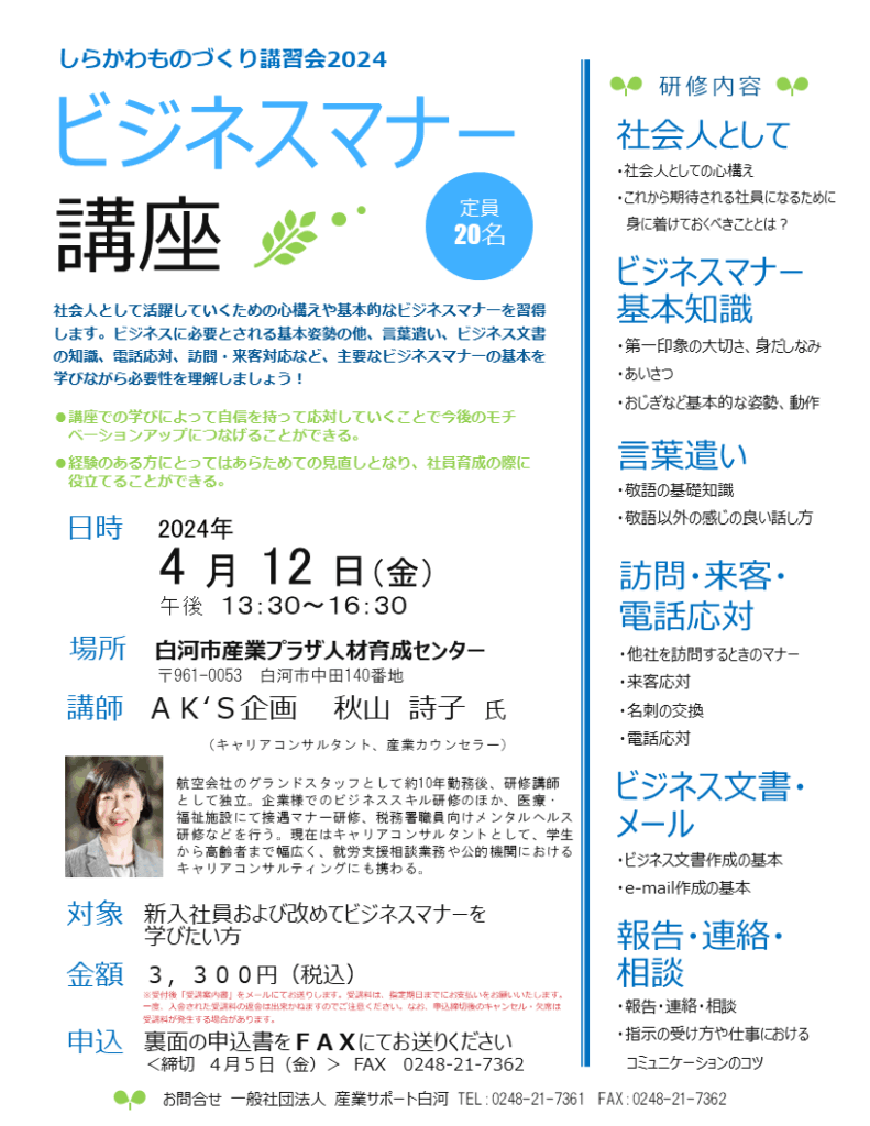 一般社団法人産業サポート白河 TEL 0248-21-7361 / FAX 0248-21-7362