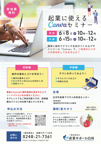 | 初級編 | 6月8日(土)10:00~12:00 | ・操作の基本とコツ・ビジネスへのCanvaの活かし方・名刺づくり 実際にパソコンで一緒に作ります |