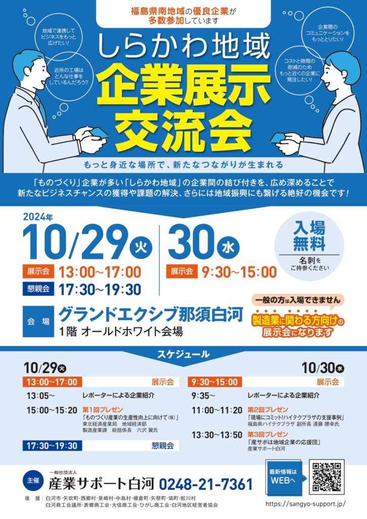 しらかわ地域は「ものづくり」企業が大変多い地域であり、それぞれがさらに繋りを広め深めることにより、企業の課題解決や地域振興に大きく貢献できるのではないかと考え、産業サポート白河では下記日程により県南地域の企業展示交流会を開催いたします。
