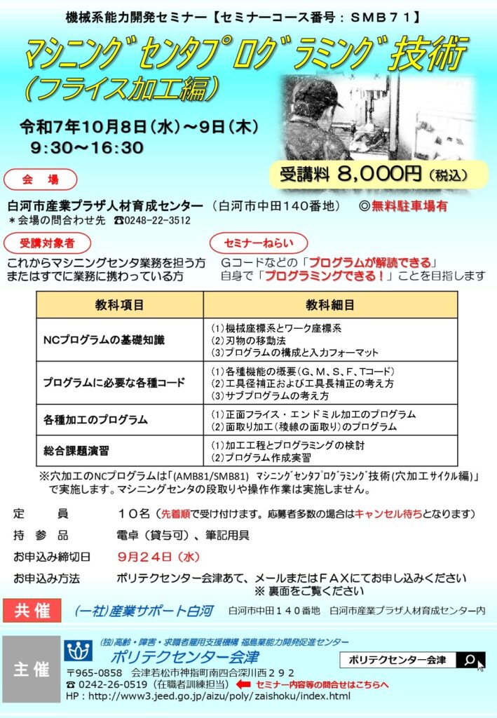 (締切ました)■10/8(水)、9(木)2日間『マシニングセンタプログラミング技術(フライス加工編)』のご案内〈主催:ポリテクセンター会津、共催:産業サポート白河〉■